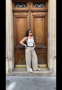 • Λευκή τοπ χωρίς τιράντες, μπεζ παντελόνι φαρδύ, μαύρη ζώνη με στρογγυλή αγκράφα, ασημένιο βραχιόλι, μικρή μαύρη τσάντα, λευκά αθλητικά παπούτσια με μαύρες λεπτομέρειες.