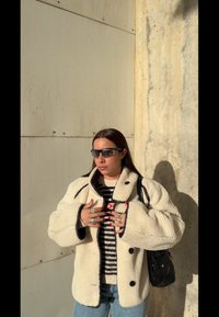• Γυναίκα με γυαλιά ηλίου, εκρού μπουφάν από μαλλί, ριγέ πουλόβερ και μπλε τζιν, στέκεται μπροστά σε υφασμάτινον μπεζ τοίχο στο ηλιακό φως.