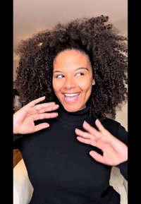 • Μαύρο σακάκι πάνω από μαύρο πουλόβερ, με τζιν. Σημαντικό περιβραχιόνιο με μαργαριτάρι και χρυσό, ασημένια σκουλαρίκια. Σγουρά �μαλλιά, χαμογελώντας σε εξωτερικό χώρο κοντά σε μοντέρνα κτίρια.