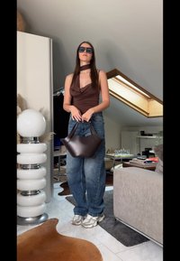 • Γυναίκα με καφέ αμάνικη μπλούζα, τζιν παντελόνι με φαρδιά πόδια, λευκά αθλητικά παπούτσια και γυαλιά ηλίου κρατώντας μια σκούρα καφέ τσάντα σε ένα μοντέρνο σαλόνι.