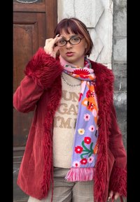 • Κοντινό πλάνο ατόμου που φοράει γυαλιά με φλοράλ μοτίβο, κόκκινο κραγιόν, πολύχρωμο φλοράλ κασκόλ, μπεζ πουλόβερ, ασημένιο κολιέ με αστέρι και κόκκινο χνουδωτό μανίκι.