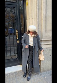 • Γυναίκα που φοράει γκρι μακρύ παλτό, μπεζ μπερέ, κρεμ πουλόβερ, μαύρες μπότες και παντελόνι με λεπτές ρίγες, στέκεται σε πεζοδρόμιο πόλης κρατώντας μία μπεζ τσάντα.