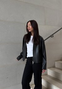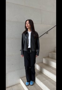 • Νεαρή γυναίκα με μακριά σκούρα μαλλιά στέκεται σε σκαλοπάτια, φορώντας μαύρο δερμάτινο μπουφάν, λευκό πουκάμισο, μαύρο παντελόνι και μπλε αθλητικά παπούτσια μπροστά σε πέτρινο τοίχο.