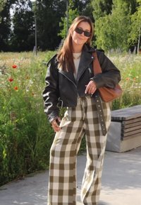 • Μπατζάκια φαρδιά με καρό σχέδιο σε πράσινο και κρεμ, συνδυασμένα με ένα ελαφρύ κρεμ πλεκτό πουλόβερ και μια μαύρη δερμάτινη τζάκε�τ.