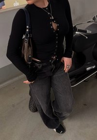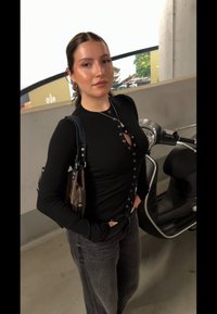 • Άτομο που φοράει μαύρο πουκάμισο με μακριά μανίκια και κουμπιά, φαρδιά σκούρα τζιν, μαύρα αθλητικά παπούτσια Puma και κρατά καφέ τσάντα ώμου, στέκεται δίπλα σε ένα σκούτερ.