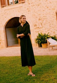 Γυναίκα με μακρύ μαύρο φόρεμα με κουμπιά και μανίκια τριών τετάρτων, και μπεζ πέδιλα με τακούνι, στέκεται μπροστά σε απλό φωτεινό φόντο.
