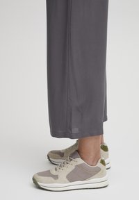 Γκρι παντελόνια σε ίσια γραμμή με ελαστική μέση, κατασκευασμένα από ελαφρύ ύφασμα. Φορεμένα με μπεζ αθλητικά παπούτσια. Λείος υφή, ώς τους αστραγάλους.