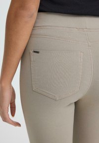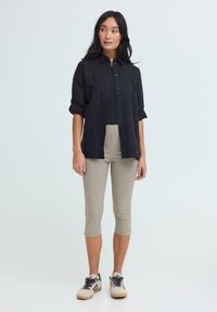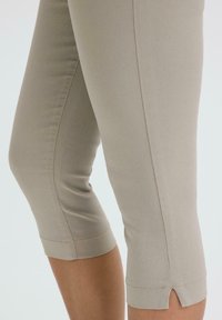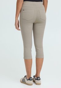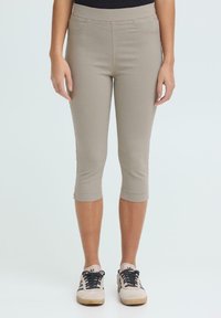 Γυναίκα που φοράει μπεζ παντελόνι cropped και ανοιχτόχρωμα αθλητικά παπούτσια με μαύρες κορδόνια, στέκεται μπροστά σε απλό φόντο.