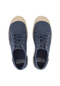 Καμβά παπούτσι χαμηλού προφίλ σε ναυτικό μπλε με μπεζ καουτσούκ κάλυμμα δακτύλων και σόλα. Διαθέτει στρογγυλά κορδόνια και υφασμένο πάνω μέρος. Σχεδίαση χαμηλού προφίλ.