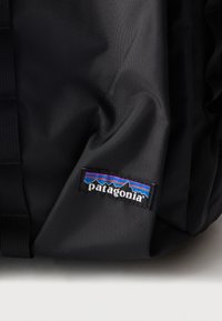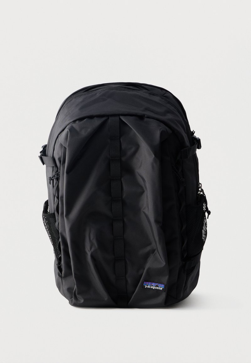 Μαύρο σακίδιο πλάτης Patagonia με κάθετο ιμάντα μπροστά, δίχτυ πλαϊνές τσέπες και επάνω διαμέρισμα με φερμουάρ σε απλό λευκό φόντο.