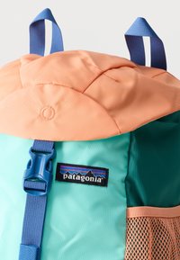 Μικρό σακίδιο με χρώματα ροδάκινου, τυρκουάζ και μπλε, δίχτυ πλαϊνές τσέπες και κεντρικό ιμάντα με αγκράφα με το λογότυπο της Patagonia στο μπροστινό μέρος.