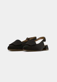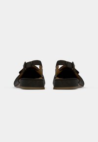 Μαύρο σουέντ παπούτσι με λουράκι στο πίσω μέρος, μυτερή μύτη, επίπεδη σόλα και διακοσμητικό κουμπί στο λουράκι του αστραγάλου. Διαθέτει λείο εσωτερικό στρώμα.