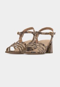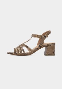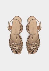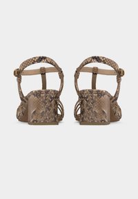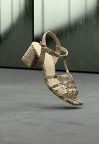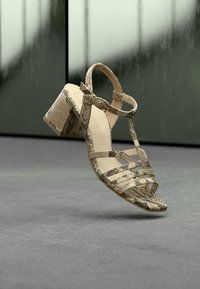 Πέδιλο με ψηλό τακούνι σε μπεζ χρώμα φιδιού, με λουράκι στον αστράγαλο και χρυσή αγκράφα, κρεμασμένο πάνω από γκρι πάτωμα με φόντο σκοτεινό και θολό.