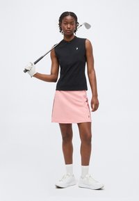 Γυναίκα με πλεξούδες που φοράει μαύρο αμάνικο τοπ με μικρό λευκό λογότυπο και φούστα σε ανοιχτό ροζ χρώμα, όρθια μπροστά σε απλό φόντο.