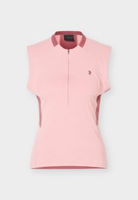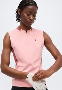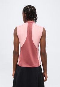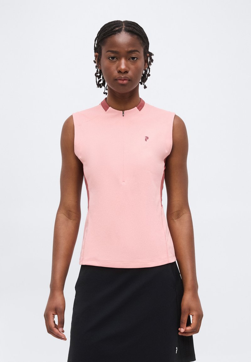 Γυναίκα με πλεξούδες, που φορά ροζ αμάνικο τοπ με φερμουάρ και μαύρη φούστα, στέκεται μπροστά σε ένα απλό φωτεινό φόντο.
