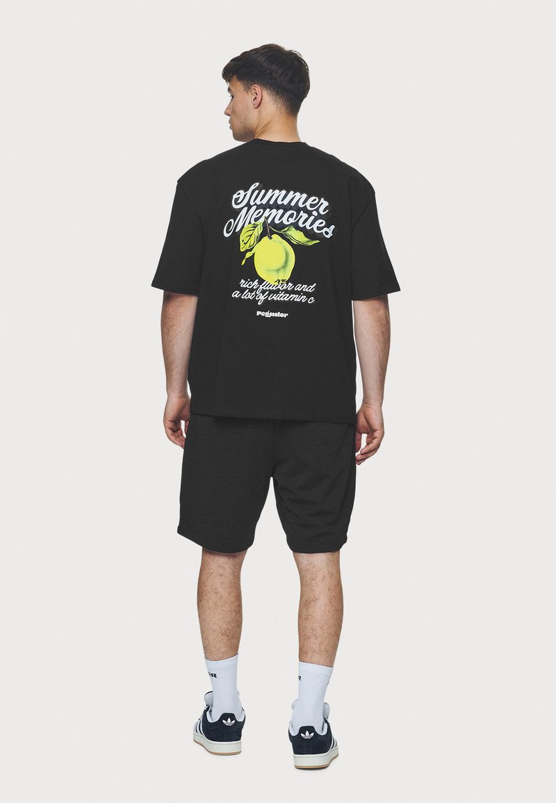 Μαύρη βαμβακερή μπλούζα με γραφικό λεμόνι και κείμενο στο πίσω μέρος, συνδυασμένη με μαύρα σορτς και μπλε αθλητικά παπούτσια με λευκές λεπτομέρειες.