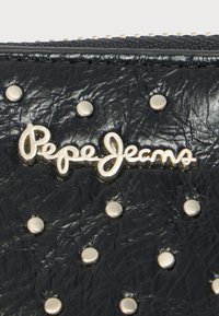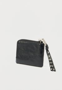 Μαύρο πορτοφόλι από δέρμα με ασημένιες τρούκς και κλείσιμο με φερμουάρ, με αποσπώμενο λουράκι και ανάγλυφο λογότυπο στο εμπρός μέρος.