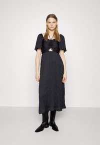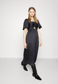 Μαύρο φόρεμα μέχρι το γόνατο με συγκεντρωμένη σιλούετα, κοντά φουσκωτά μανίκια και ανοιχτό στοιχείο στη μέση. Λείο, ζαρωμένο υλικό.