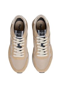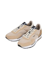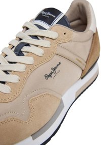 Μπεζ και καφέ σουέντ και υφασμάτινο αθλητικό παπούτσι με λευκά κορδόνια, μαύρη και λευκή σόλα και το λογότυπο "Pepe Jeans" στο πλάι.