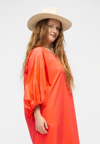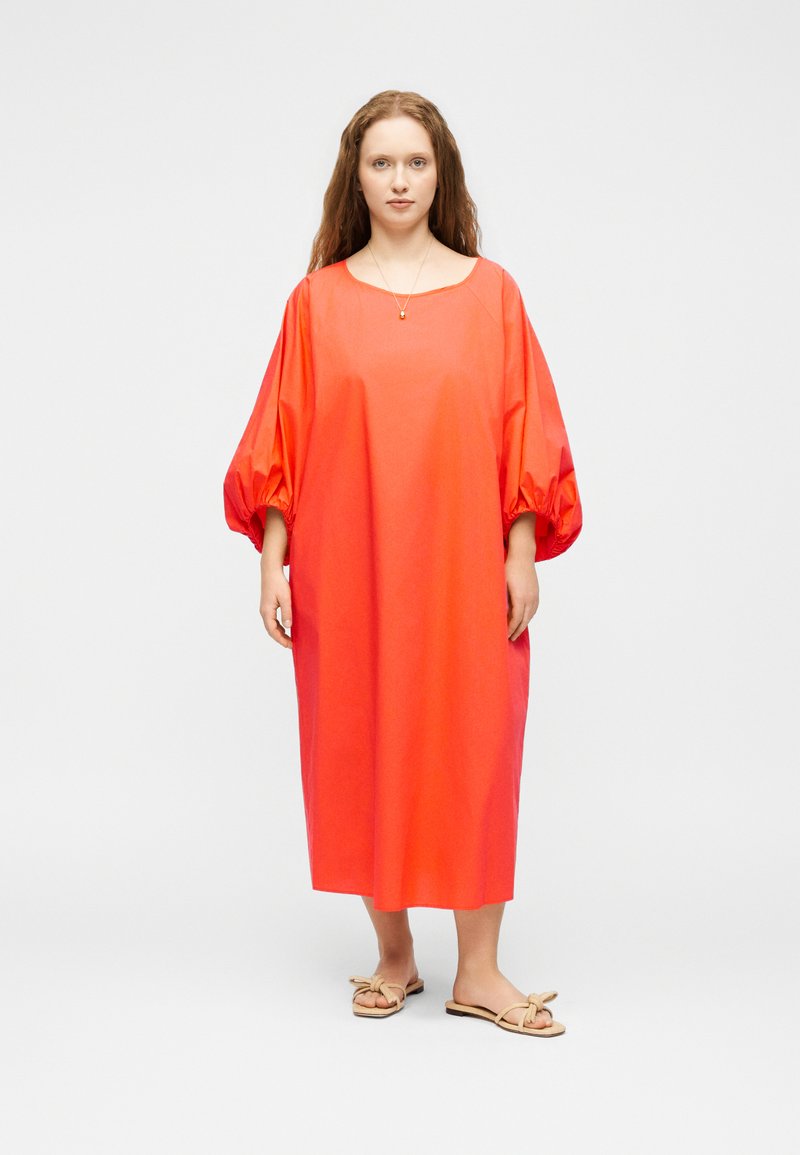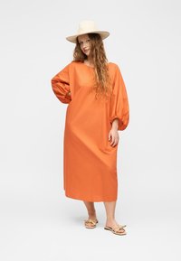 Γυναίκα που στέκεται φορώντας ένα χαλαρό, φωτεινό πορτοκαλί midi φόρεμα με φουσκωτά μανίκια και μπεζ σανδάλια, μπροστά σε απλό λευκό φόντο.