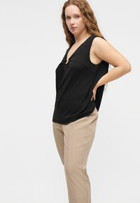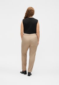 Μπεζ παντελόνι σε μήκος μέχρι τον αστράγαλο, σχεδιασμένο κατά παραγγελία, φορεμένο με μαύρο τοπ και σκούρα καφέ δερμάτινα παπούτσια με τακούνι, στέκεται σε απλό λευκό φόντο.