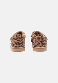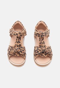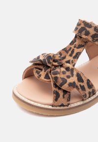 Παιδικό σανδάλι με λεοπάρ σχέδιο, ρυθμιζόμενο λουράκι και διακοσμητικό φιόγκο, επίπεδη σόλα και ανοιχτό σχέδιο στα δάχτυλα, πάνω σε λευκό φόντο.