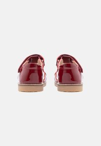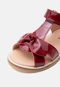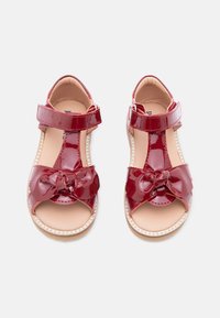 Κόκκινο γυαλιστερό σανδάλι για νήπια με λεπτομέρεια φιόγκος, ρυθμιζόμενο λουράκι βέλκρο και μπεζ καουτσούκ σόλα πάνω σε λευκό φόντο.