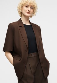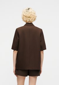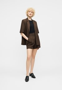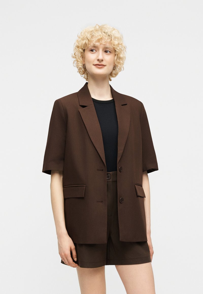Νεαρός με σγουρά ξανθά μαλλιά, φορώντας καφέ κοντομάνικο σακάκι και ταίριαζα σορτς πάνω από μαύρο τοπ, στέκεται μπροστά σε λευκό φόντο.
