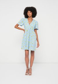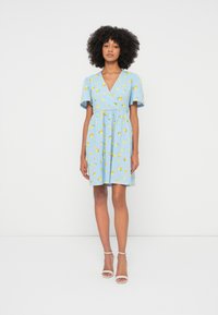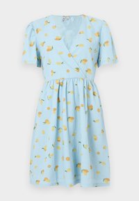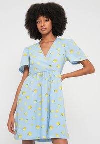 Φόρεμα κοντομάνικο σε ανοιχτό γαλάζιο με σχέδιο τύλιγμα, μοτίβο με κίτρινες λεμονιές, με σφιχτή μέση και φούστα που ανοίγει.