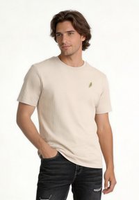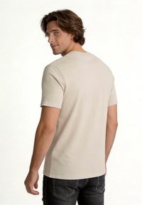 Άνδρας που στέκεται, φοράει μπεζ κοντομάνικο μπλουζάκι, μαύρο σκισμένο στενό τζιν και καφέ αθλητικά παπούτσια σε λευκό φόντο.
