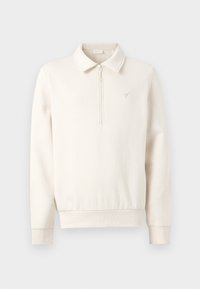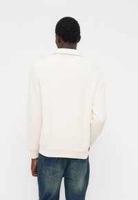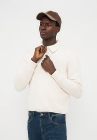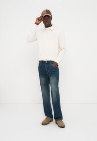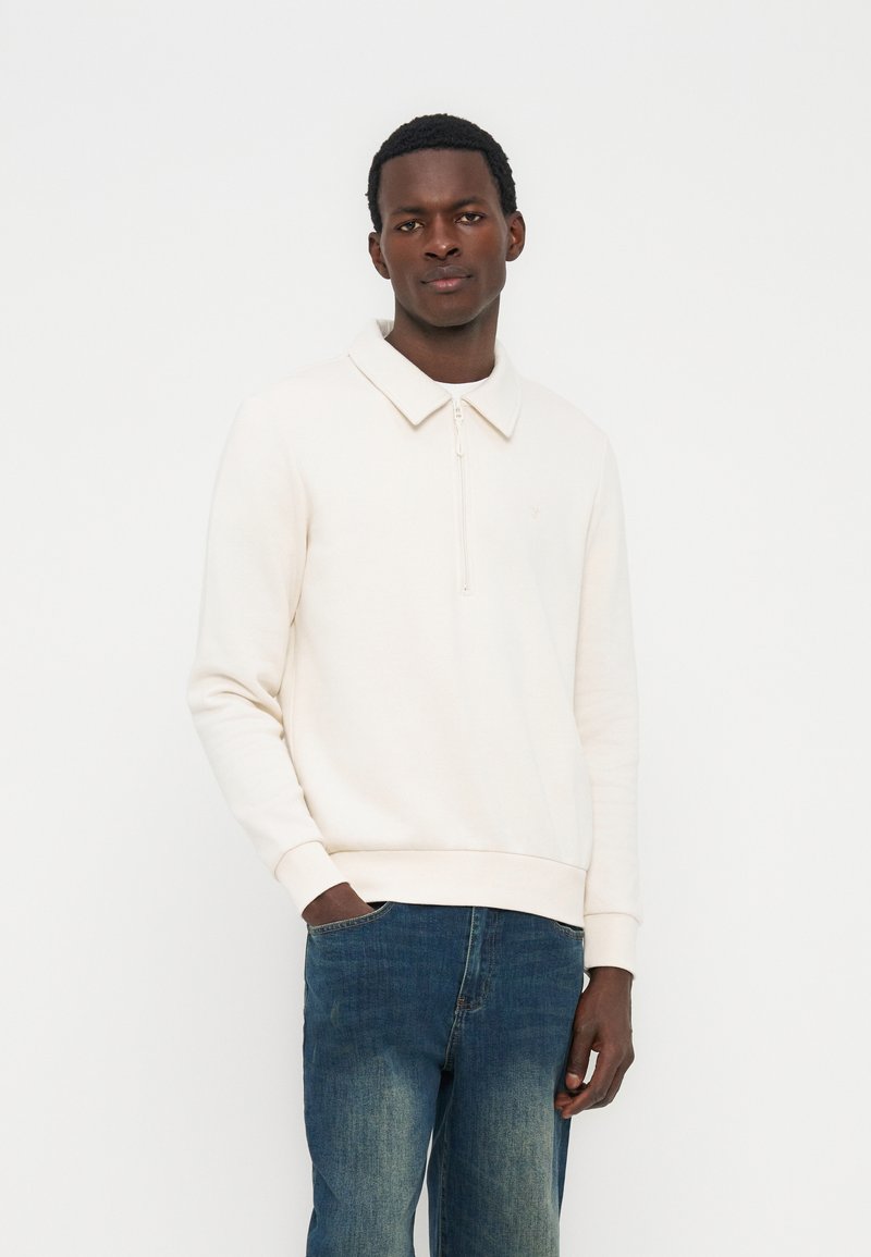 Νεαρός άνδρας με σκούρο δέρμα που φοράει λευκό μακρυμάνικο πουλόβερ με γιακά και φερμουάρ, συνδυασμένο με μπλε τζιν παντελόνι, στέκεται μπροστά σε λευκό φόντο.