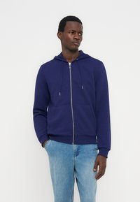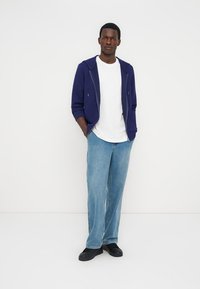 Νεαρός με σκουρόχρωμο δέρμα, ντυμένος με μπλε σκούρο κοντό μπουφάν με φερμουάρ και ανοιχτό μπλε τζιν, στέκεται με το ένα χέρι στην τσέπη.