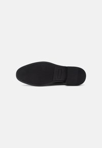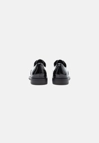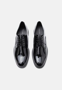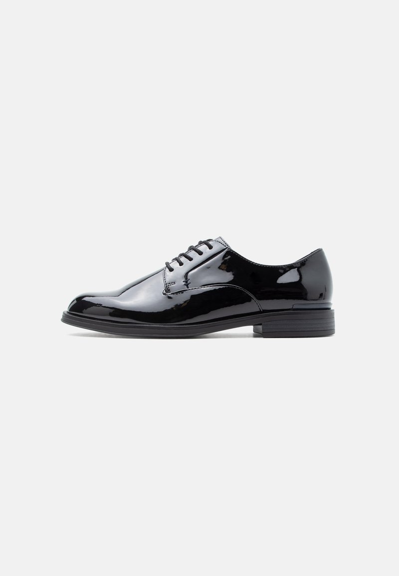 Μαύρο επίσημο ανδρικό παπούτσι από λουστρίνι με κλειστή δέση κορδονιών και χαμηλή σκαλωτή φιάλη, παρουσιάζεται σε προφίλ σε λευκό φόντο.
