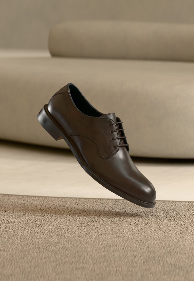Καφέ δερμάτινο επίσημο παπούτσι με κορδόνια που αιωρείται πάνω από μπεζ χαλί με ανοιχτό καφέ καναπέ στο παρασκήνιο.