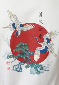 Άνδρας φαίνεται από πίσω φορώντας λευκό μπλουζάκι με σχέδιο δύο γερανών, ένα δέντρο και έναν κόκκινο ήλιο με κάθετους ασιατικούς χαρακτήρες.