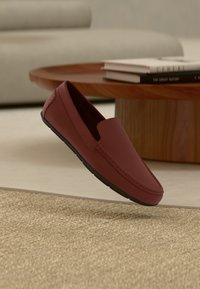 Σκούρο καφέ loafer χωρίς κορδόνια που αιωρείται πάνω από μια μπεζ υφασμάτινη μοκέτα, με ένα στρογγυλό ξύλινο τραπεζάκι καφέ και θολωμένα βιβλία στο φόντο.