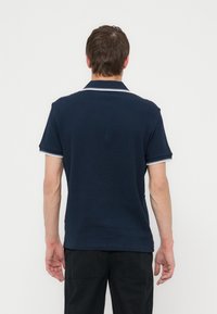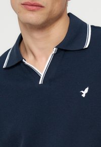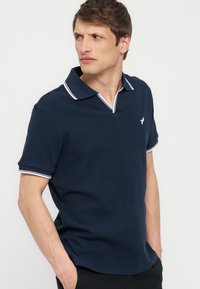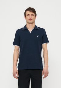 Άνδρας που φοράει μπλε σκούρο πόλο με λευκά περιθώρια στον γιακά και τα μανίκια, στέκεται μπροστά σε απλό φωτεινό φόντο.