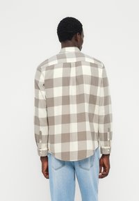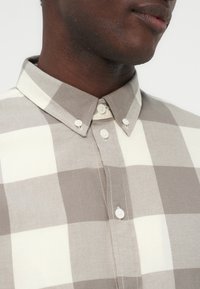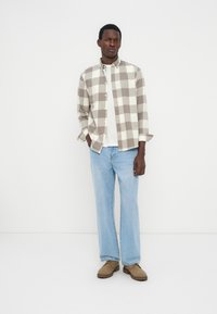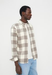 Άνδρας που φοράει μπεζ και λευκό πουκάμισο με καρό και ανοιχτόχρωμο τζιν, στέκεται μπροστά σε ένα απλό λευκό φόντο.