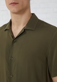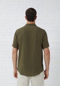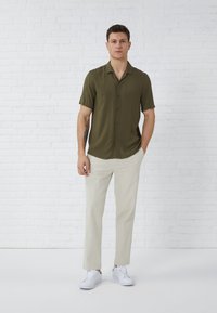 Άνδρας με πουκάμισο κοντομάνικο ελιάς και ανοιχτό μπεζ παντελόνι, στέκεται μπροστά σε λευκό τοιχο από τούβλα, κοιτάζοντας αριστερά.