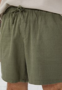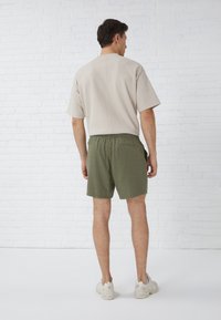 Άνδρας που φοράει χακί βερμούδα με κορδόνι και λευκά αθλητικά παπούτσια στέκεται μπροστά σε έναν λευκό τοίχο από τούβλα.