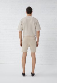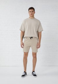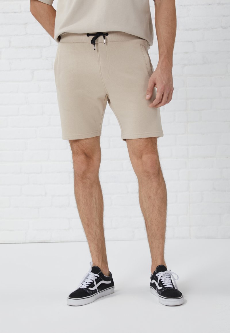 Άνδρας που φοράει μπεζ σορτς με κορδόνι και ασπρόμαυρα αθλητικά παπούτσια, στέκεται μπροστά σε λευκό τοιχο από τούβλα.