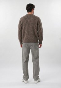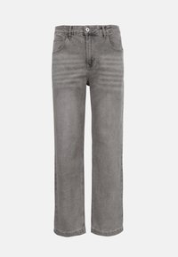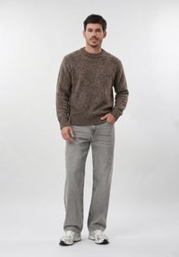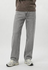 Άτομο που φοράει άνετο γκρι τζιν και λευκά-γκρι αθλητικά παπούτσια, όρθιο μπροστά σε απλό ανοιχτό φόντο.