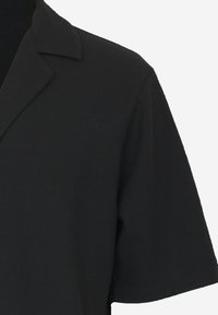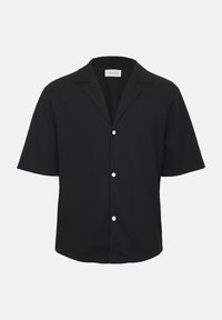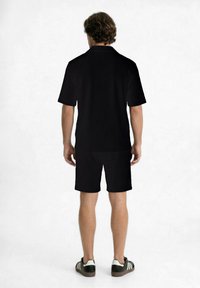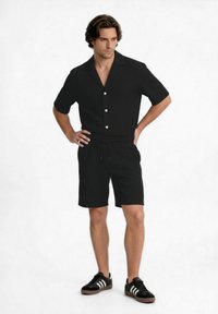 Άνδρας που στέκεται φορώντας μαύρο πουκάμισο με κοντά μανίκια και κουμπιά, ταιριαστό σορτς και μαύρα αθλητικά παπούτσια με άσπρες ρίγες σε λευκό φόντο.