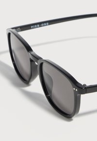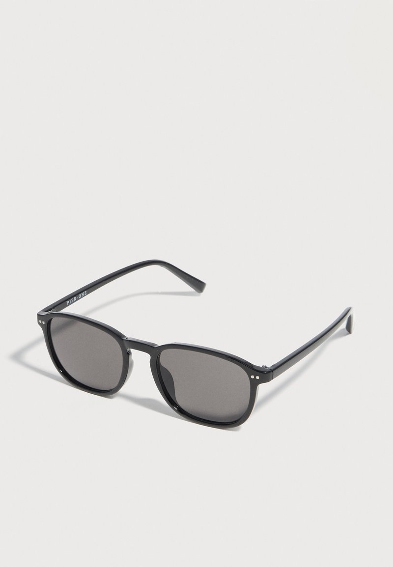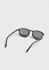 Μαύρα ορθογώνια γυαλιά ηλίου με σκουρόχρωμους φακούς και λεπτούς βραχίονες που ακουμπούν σε λευκή επιφάνεια.