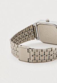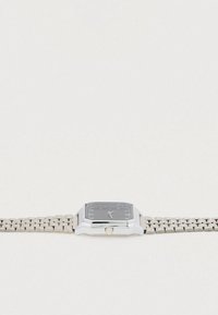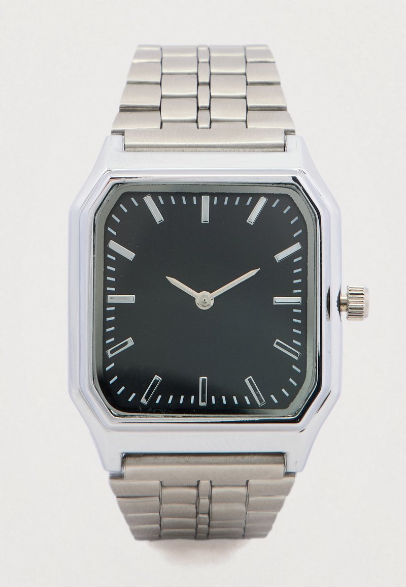 Ασημένιο τετράγωνο ρολόι με μαύρο καντράν, ασημένιους δείκτες ώρας και μεταλλικό μπρασελέ με κρίκους. Δείχνει μίνιμαλ σχεδιασμό και απλές λεπτομέρειες.