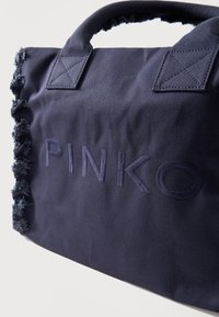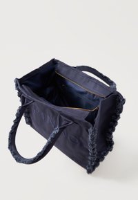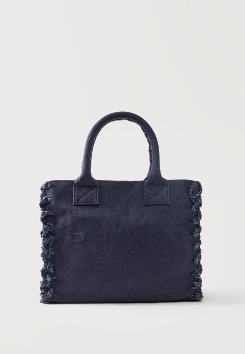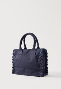 Τσάντα ώμου ορθογώνια σε σκούρο μπλε χρώμα με κοντές λαβές και ξεφτισμένες άκρες στις πλευρές, με διακριτικό ανάγλυφο όνομα της μάρκας στο μπροστινό μέρος.