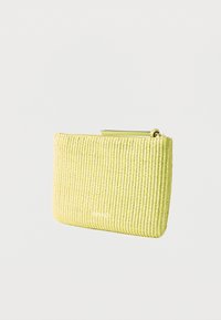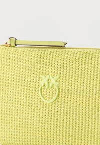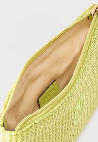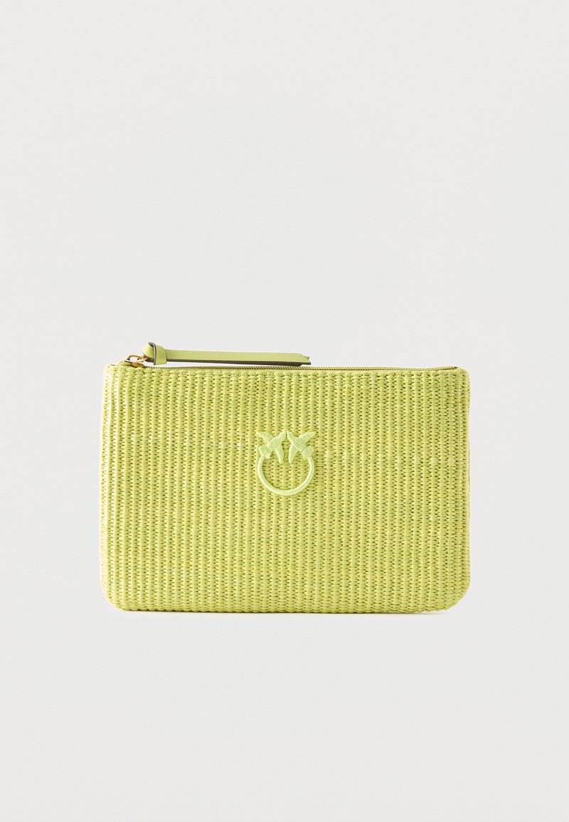 Φωτεινό πράσινο υφαντό ορθογώνιο τσαντάκι με φερμουάρ στην κορυφή και μικρό κεντημένο λογότυπο πουλιού στο κέντρο.