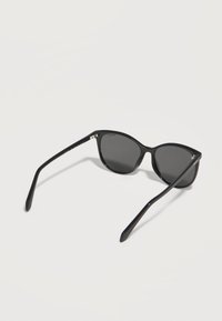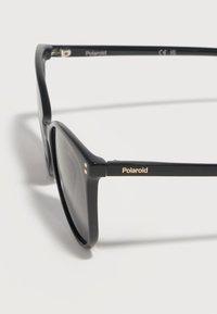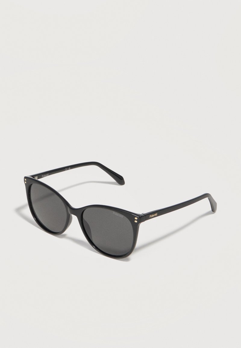 Μαύρα γυαλιά ηλίου Polaroid με στρογγυλές τετράγωνες σκελετούς και σκουρόχρωνους πολωμένους φακούς πάνω σε ανοιχτό γκρι επιφάνεια.