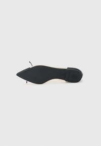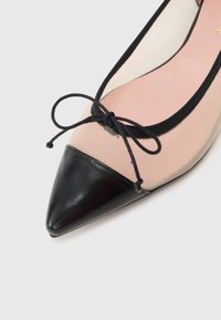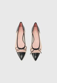 Μαύρο μπαλέτο με μυτερή μύτη, διάφανα μπεζ πλαϊνά, μαύρο περίγραμμα και μικρό φιόγκο στην κορυφή.