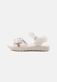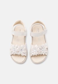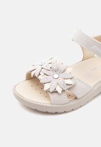 Μπεζ παιδικό σανδάλι με ρυθμιζόμενο λουράκι αστραγάλου, διακοσμητικό λουλούδι με στρας στο μπροστινό λουράκι και υφασμένη λαστιχένια σόλα.